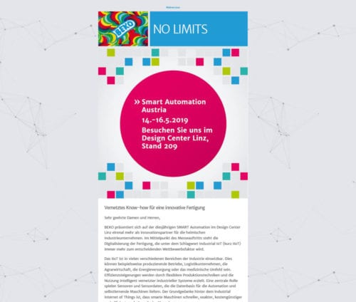 Website für für Österreichischen Technologiedienstleister. Struktur, Didaktik, Screendesign, Bildkonzept, Programmierung. beko.wordup.at